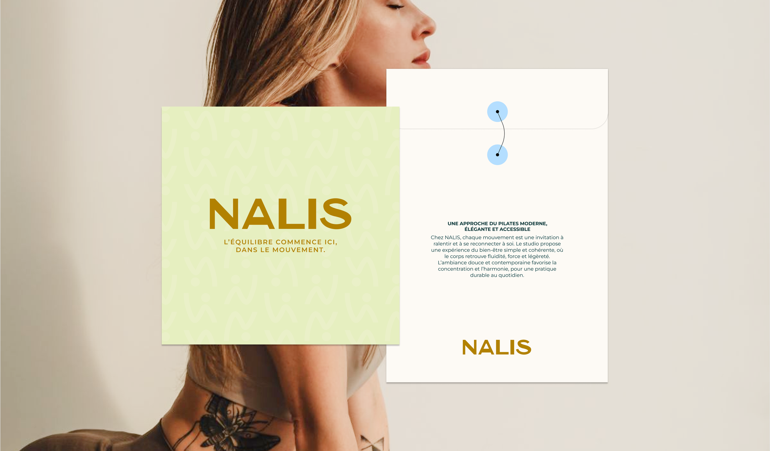 Une identité visuelle équilibrée, moderne et apaisante, pensée pour un studio de Pilates où le mouvement devient un art de vivre.